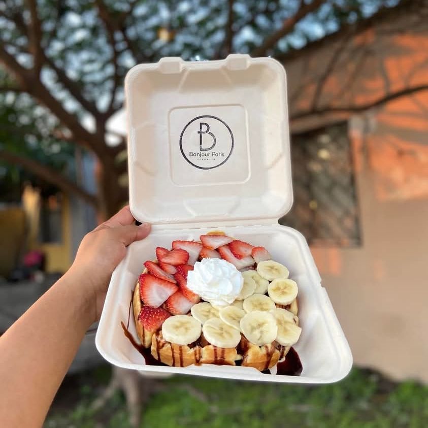Delicioso Waffle Belga crujiente y suave ala vez con un sabor casero decorado con un jarabe y dos frutas a su eleccion
