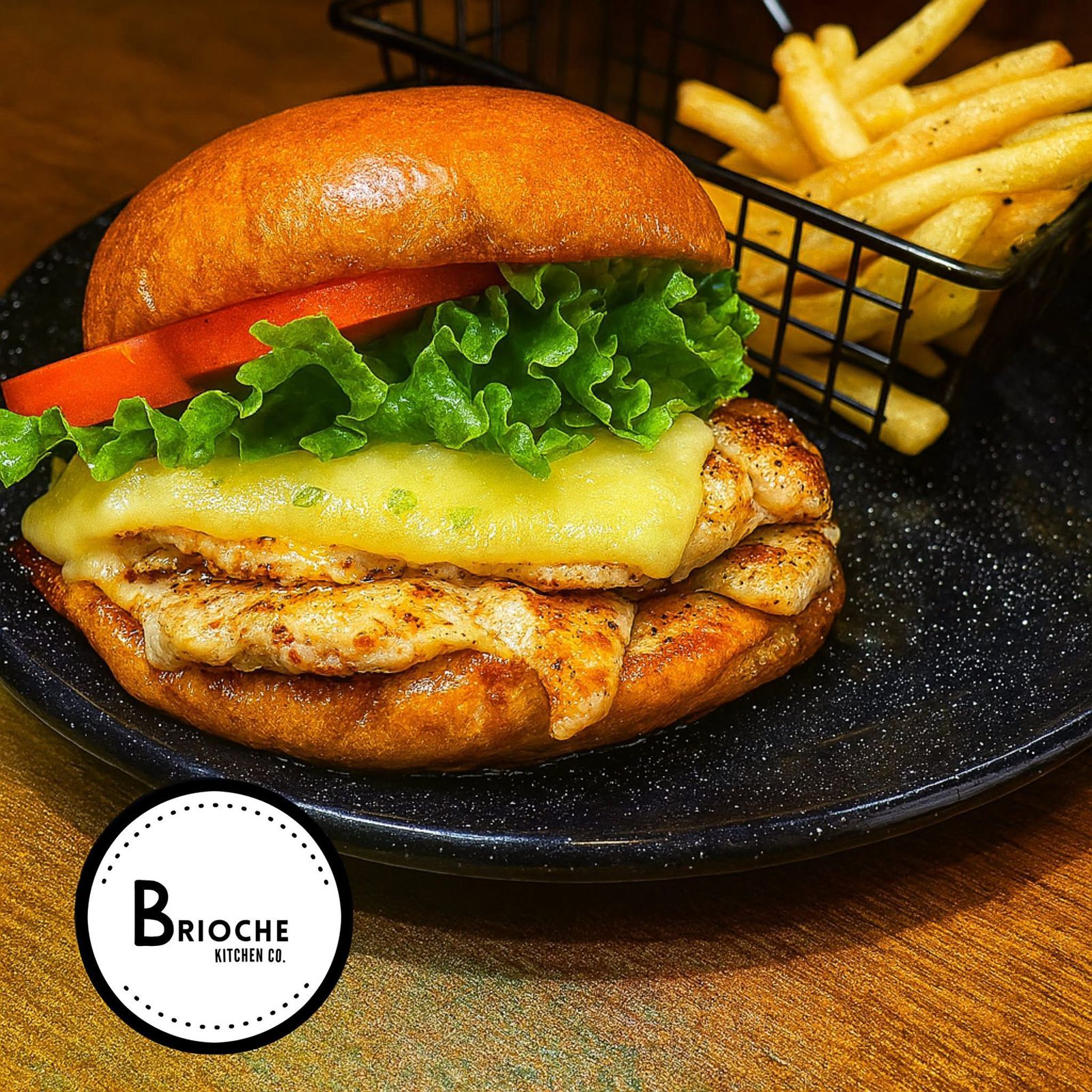 Pan brioche, pechuga de pollo al grill, queso gouda gratinado, aderezo de la casa, lechuga y tomate, acompañada de papas a la francesa, pepinillos y jalapeños.