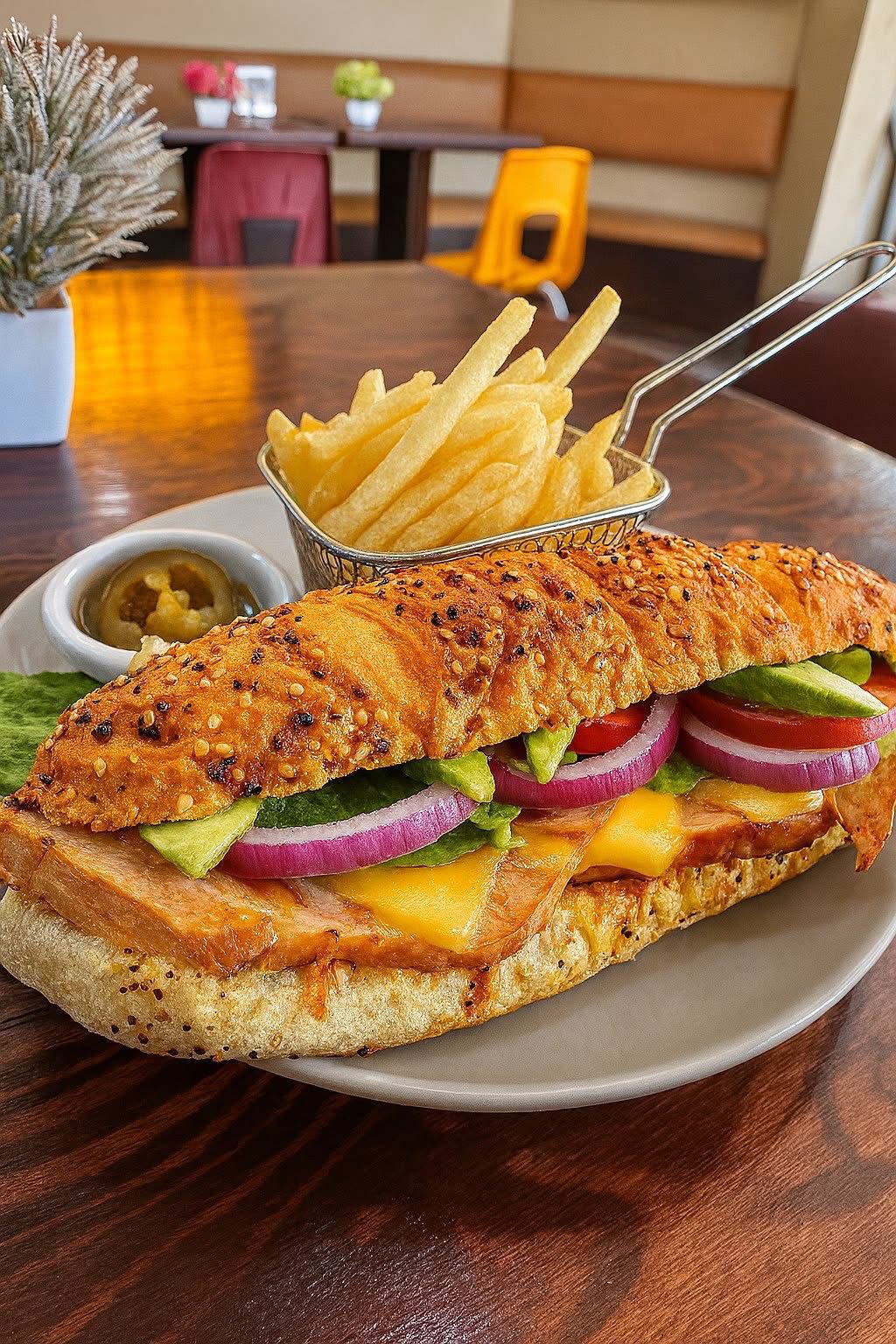 Pan baguette, jamón de pechuga de pavo a la plancha, queso gouda y cheddar gratinados, lechuga, tomate, cebolla morada, aguacate y aderezo de la casa, acompañado de ensalada fresca o papas a la francesa.