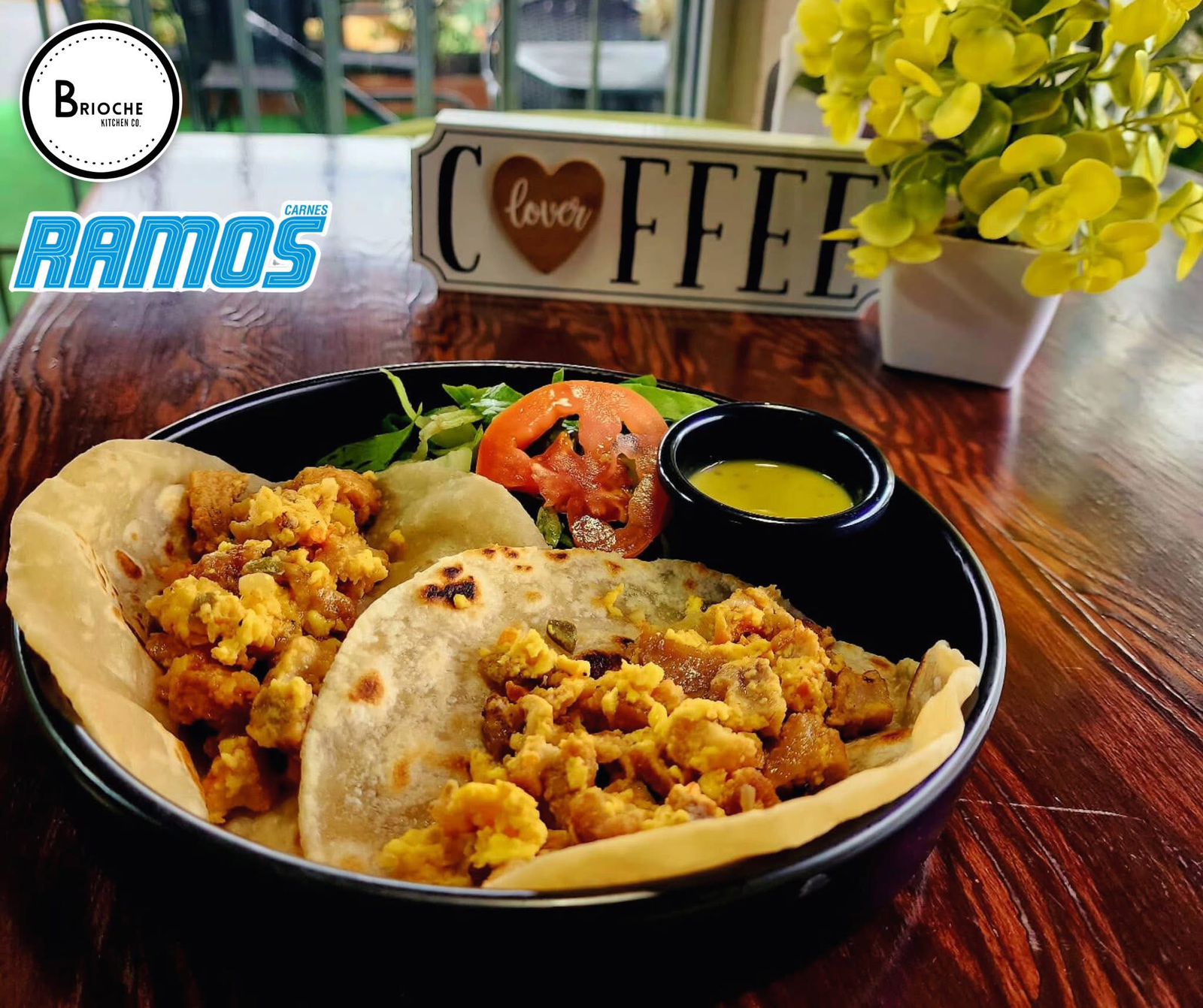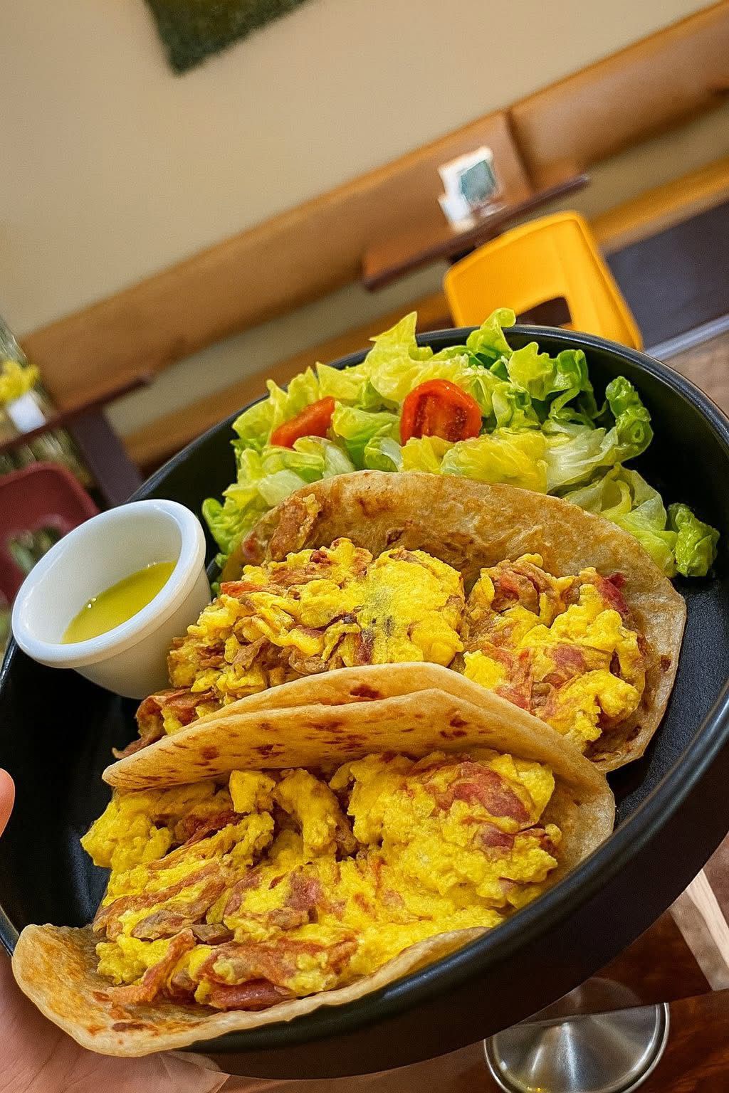 2 Tortillas de harina con huevo con chicharrón de la ramos, acompañado de ensalada fresca., lechuga y tomate.