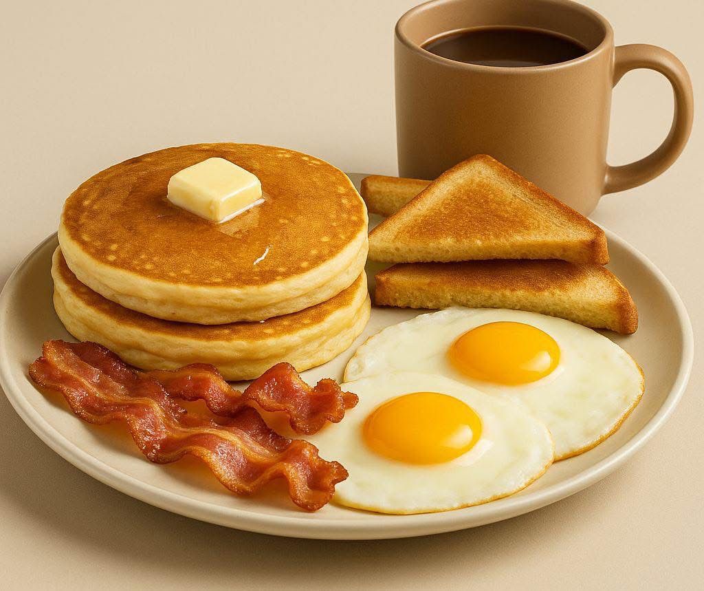 2 Huevos estrellados o revueltos, 2 tocinos, 2 hot cakes, pan tostado y papa hasbrown.
