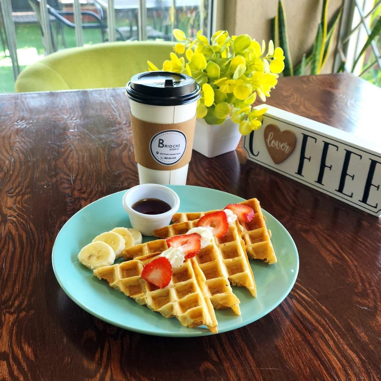 2 Waffles con fresa, plátano, miel y mantequilla.