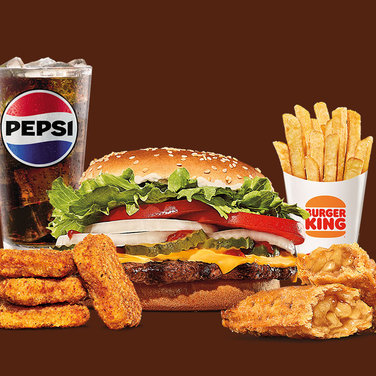 La tradicional Whopper, con carne de res a la parrilla, con dos rebanadas de queso americano, pepinillos, salsa ketchup, rodajas de cebolla, jugosas rebanadas de tomate cortadas en el momento, lechuga fresca, mayonesa, sobre un pan suave con ajonjolí. Acompañada de papas grandes y refresco.