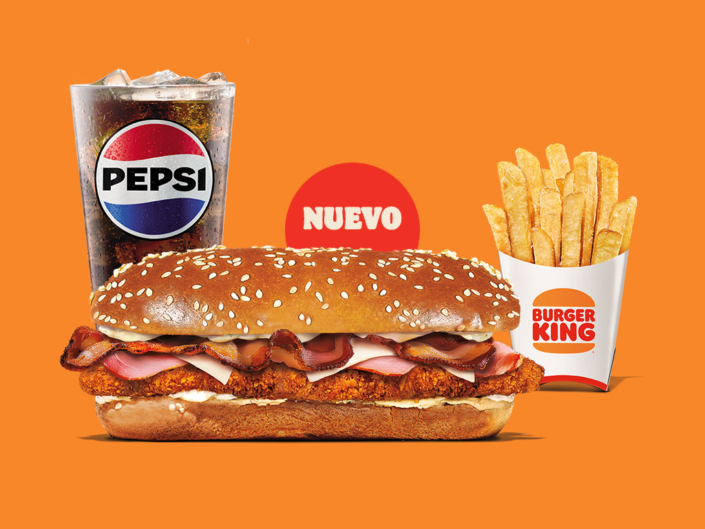 Nuestro original King de Pollo® con pollo empanizado con dos rebanadas de queso amarillo y combinación de lechugas y mayonesa cremosa sobre un pan suave alargado con ajonjolí. Acompañada de papas grandes y refresco.