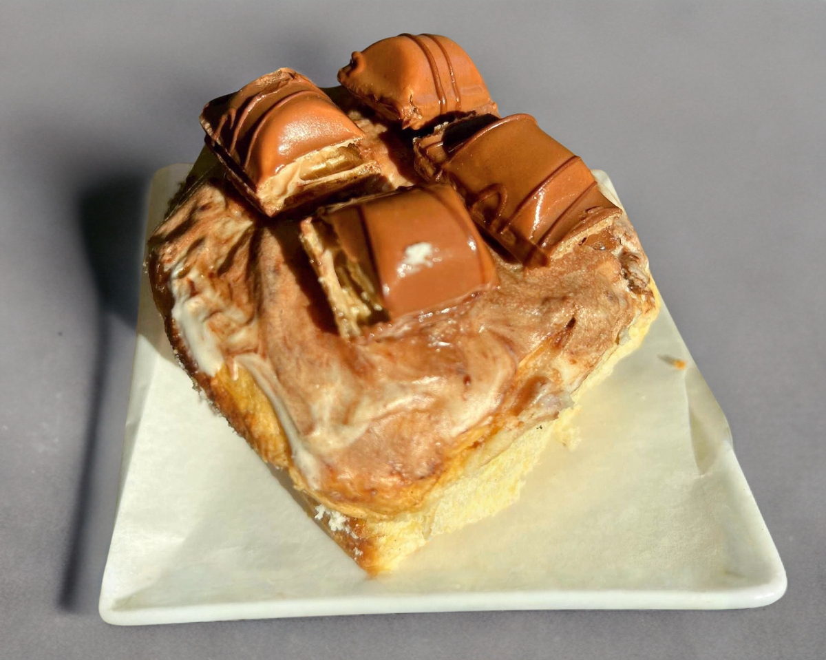 Rol de canela con glaseado a base de queso crema, crema de avellana como topping y 4 trozos de chocolate kinder bueno