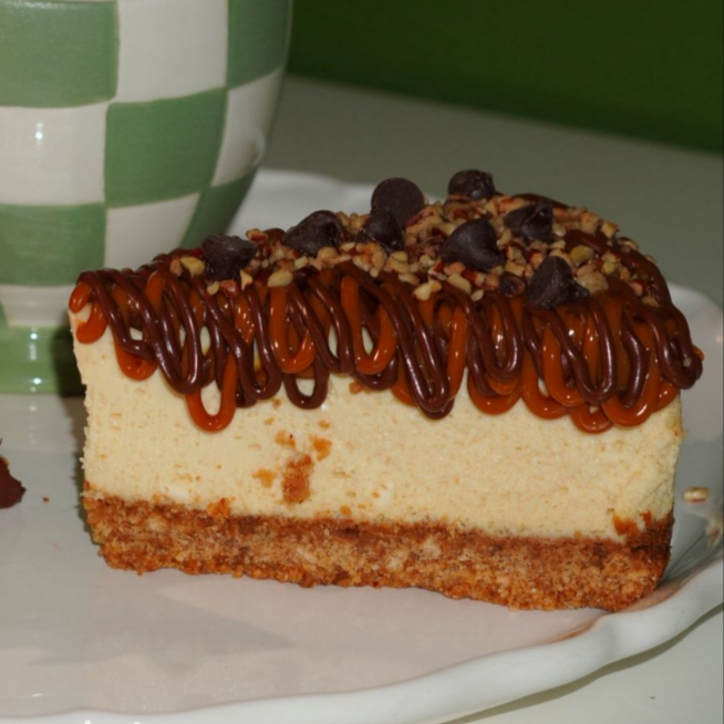 Deliciosa rebanada de cheesecake cremosa con un base de galleta endulzada con azúcar y nuez, con dulce de leche, crema de avellana, nuez y chispas de chocolate como topping