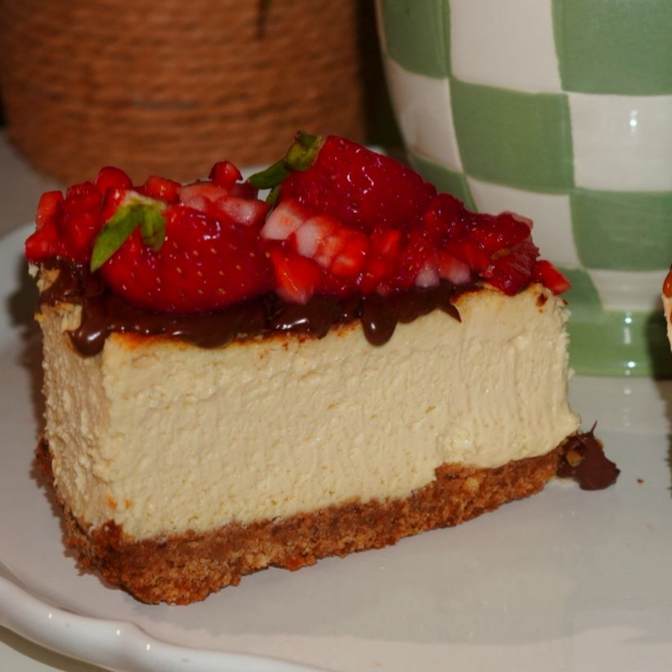 Deliciosa rebanada de cheesecake cremosa con un base de galleta endulzada con azúcar y nuez con crema de avellana y fresa como topping