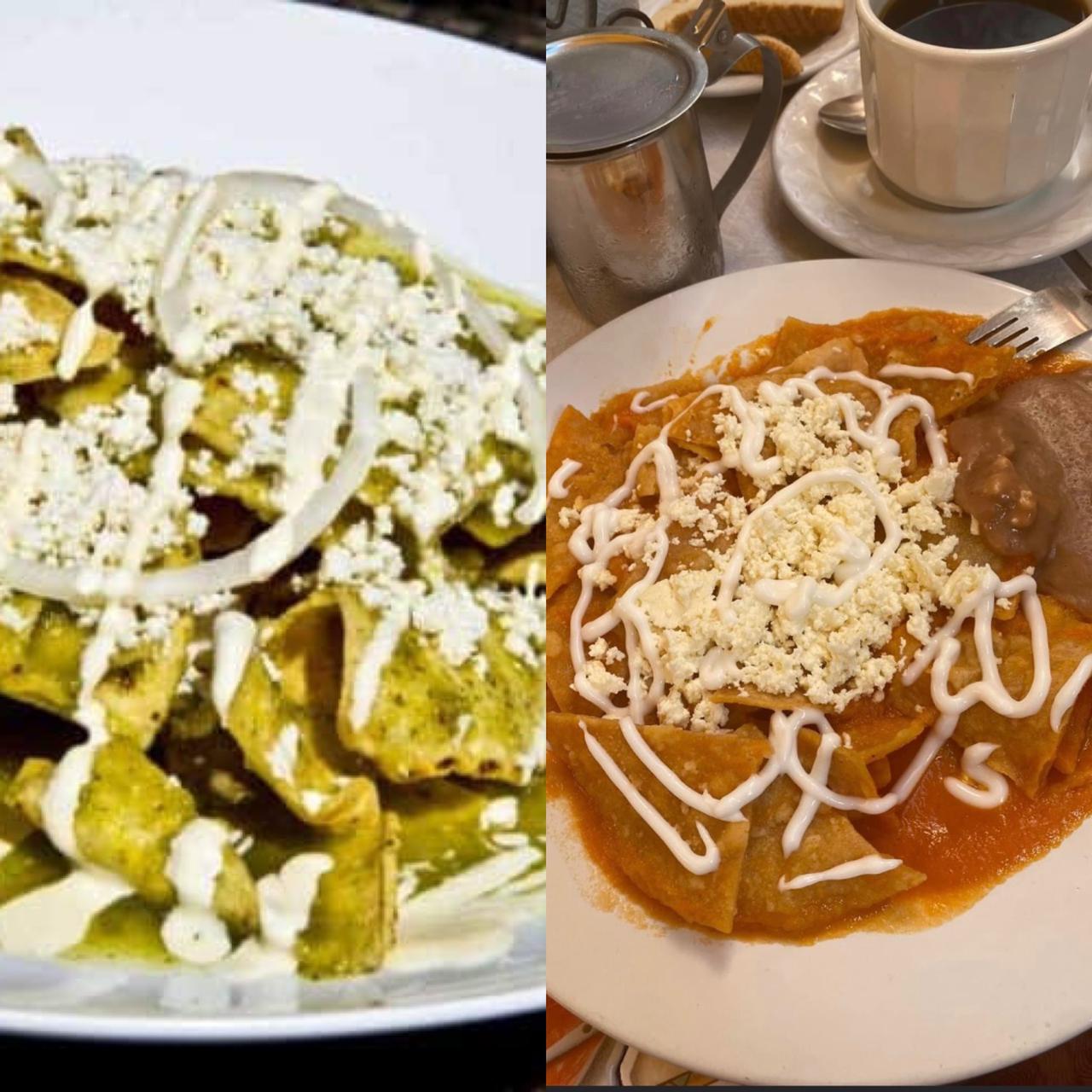 Chilaquiles rojos, 2 huevos estrellados, 1 porcion de chicharrón en salsa verde, queso asadero, aguacate. Servidos con frijoles refritos y pan tostado