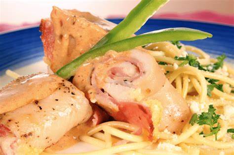 Con jamón y queso amarillo. Acompañada con espagueti blanco, puré de papa y pan garlic butter.