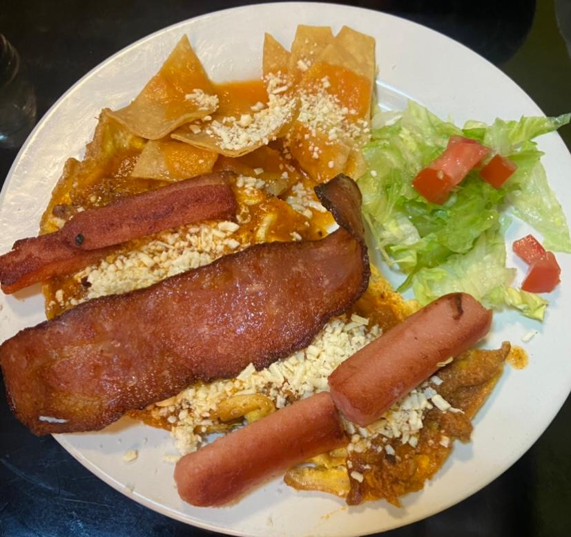 Servido con salchicha y tocino, relleno con frijoles y queso amarillo y bañado en deliciosa salsa de chorizo. Acompañado con chilaquiles y tortillas de maíz hechas a mano