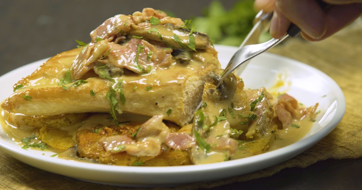 Pechuga c/ jamón y queso en Crema de Champiñones