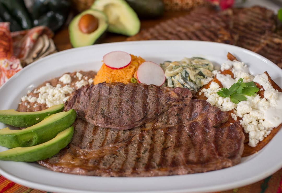 Servido con arroz, frijoles refritos y tortillas de maíz hechas a mano
