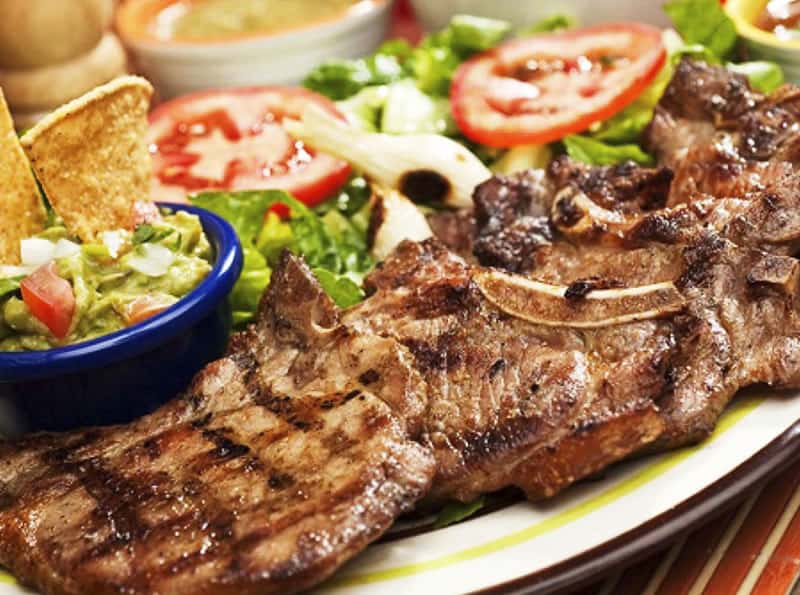 Acompañada de arroz, frijoles, papas fritas y ensalada.