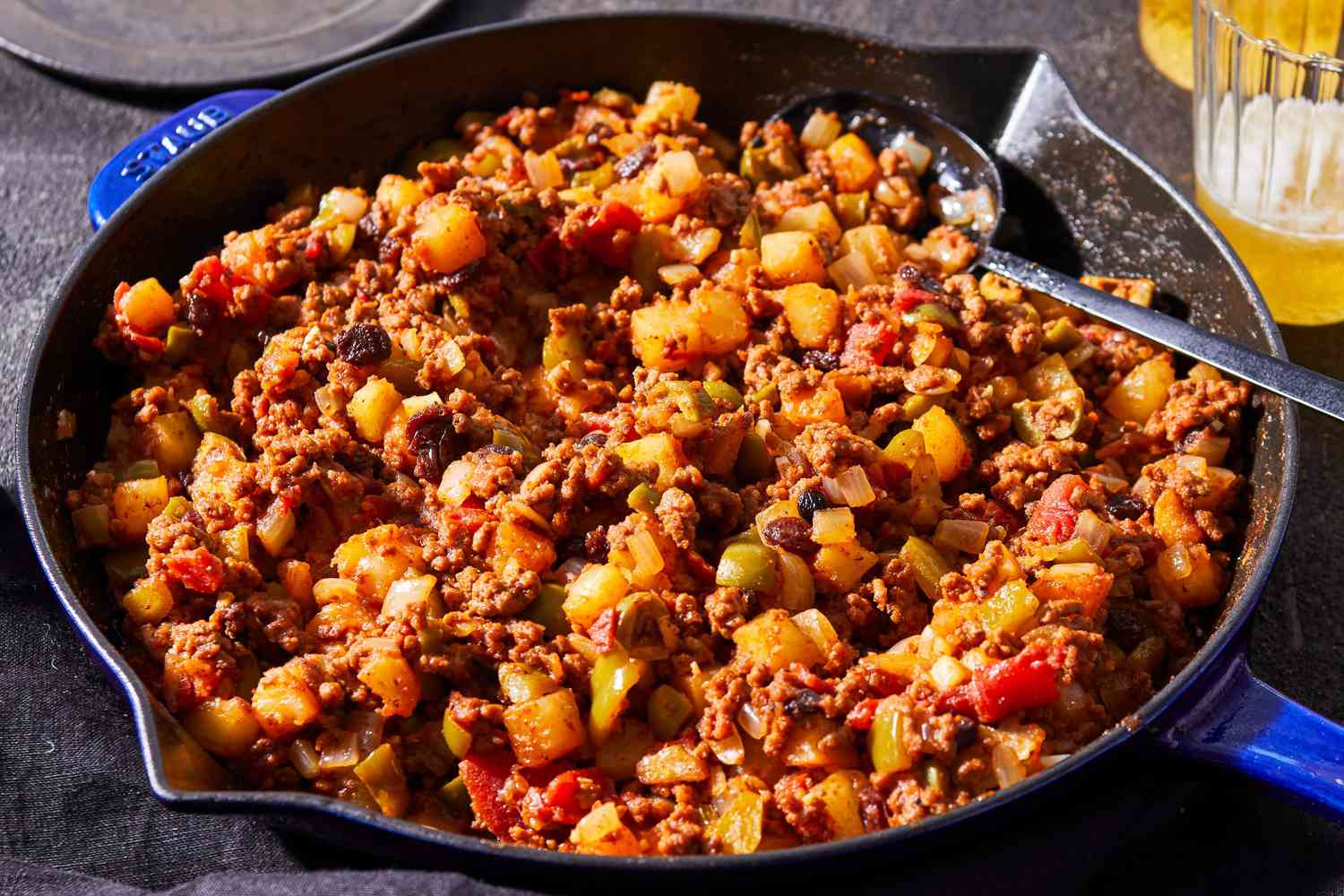 Exquisito platillo de picadillo con guarnición de arroz y frijoles.