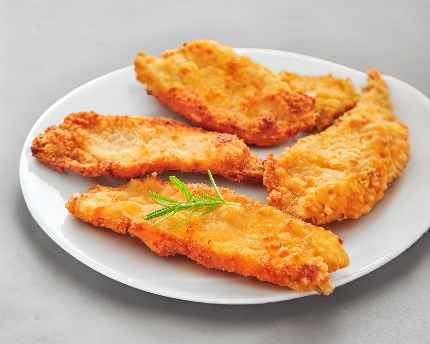 Deliciosa carne empanizada de pollo, acompañada de arroz, frijoles, papas fritas y ensalada.