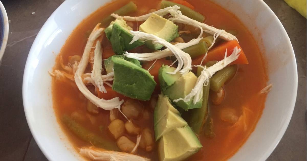 Delicioso platillo de pechuga de pollo en salsa poblana, acompañada de verduras al vapor.