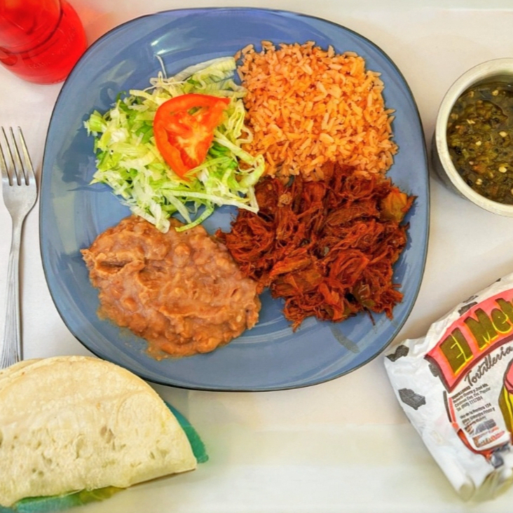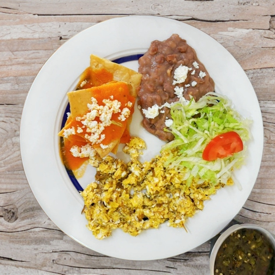 Almuerzo acompañado de frijoles refritos, lechuga o totopos