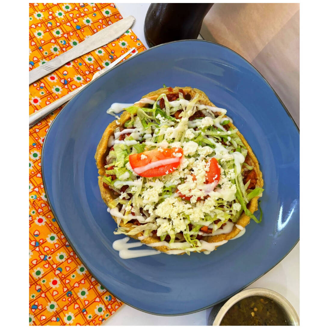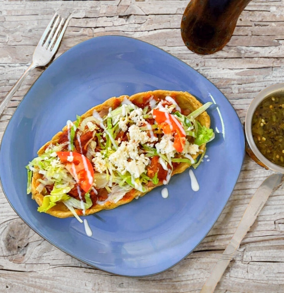 Huarache con frijoles, lechuga, tomate, queso y guiso a elegir