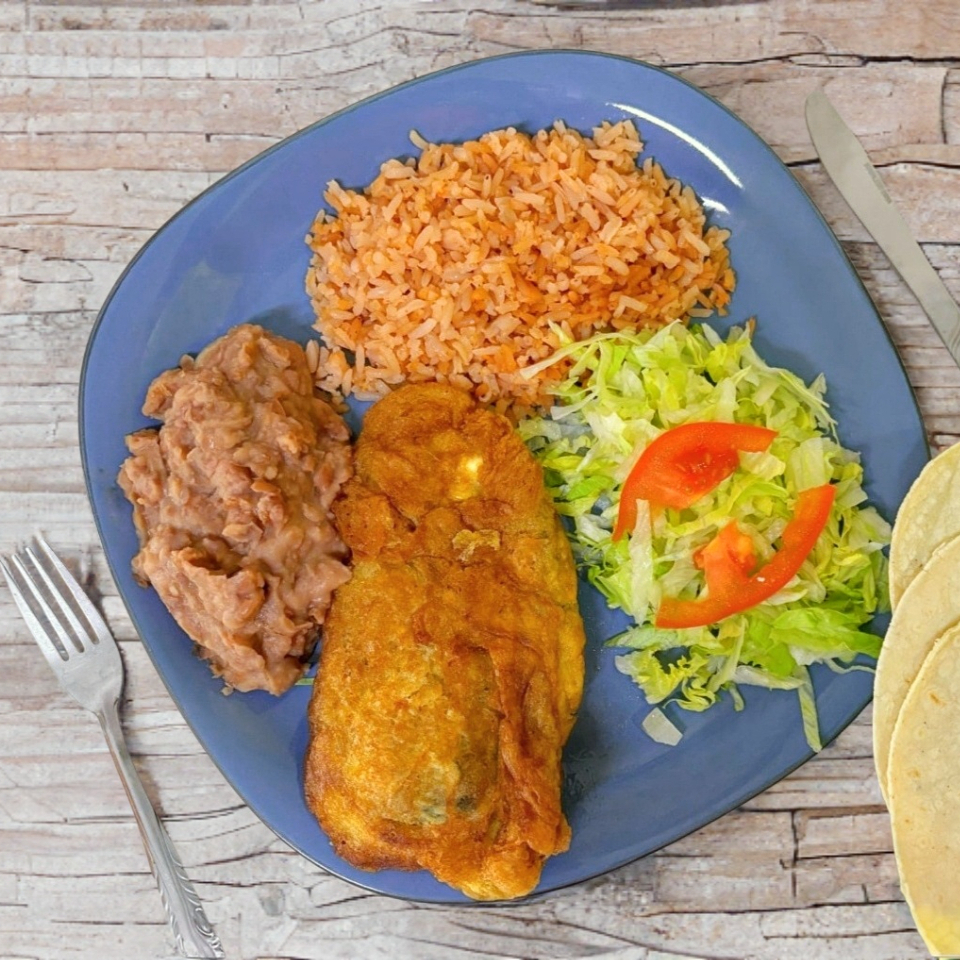 1pz Chile Poblano acompañado de frijoles refritos, lechuga y arroz