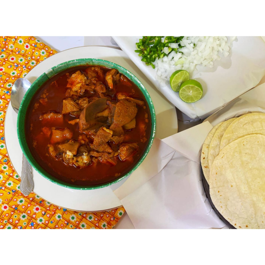 Rico menudo acompañado de cebolla, cilantro y limon