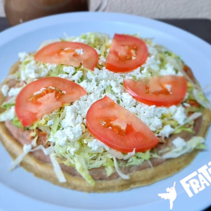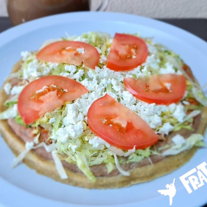 De maiz con frijoles, guiso a elegir, con lechuga, queso fresco y tomate.