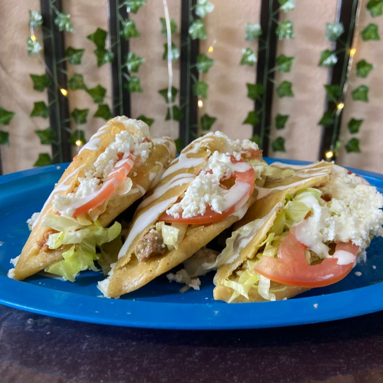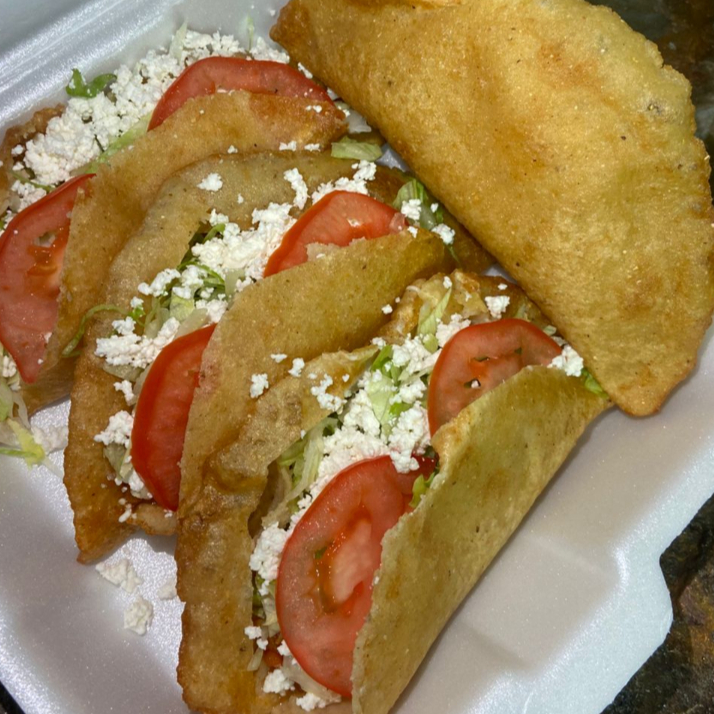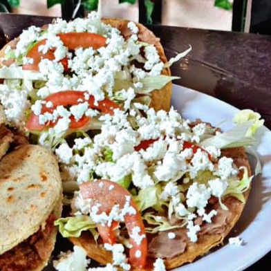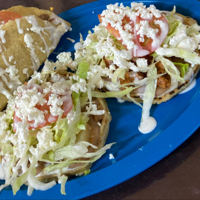 De maiz frita, rellena de queso asadero con guiso a elegir, con lechuga, queso fresco y tomate.