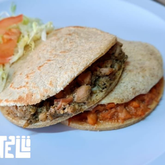 De maiz, con frijoles, con uno o dos guisos a elegir, lechuga, queso fresco y tomate.