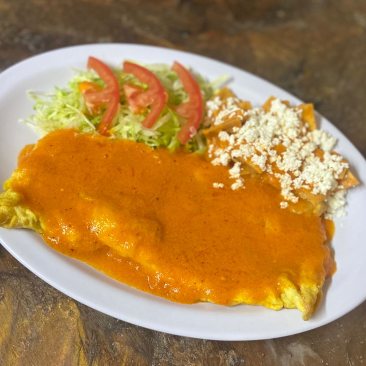 Torta de huevo rellena de frijoles, bañada en salsa de tomate acompañado de una porción de chilaquiles y lechuga.