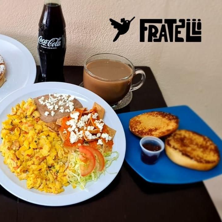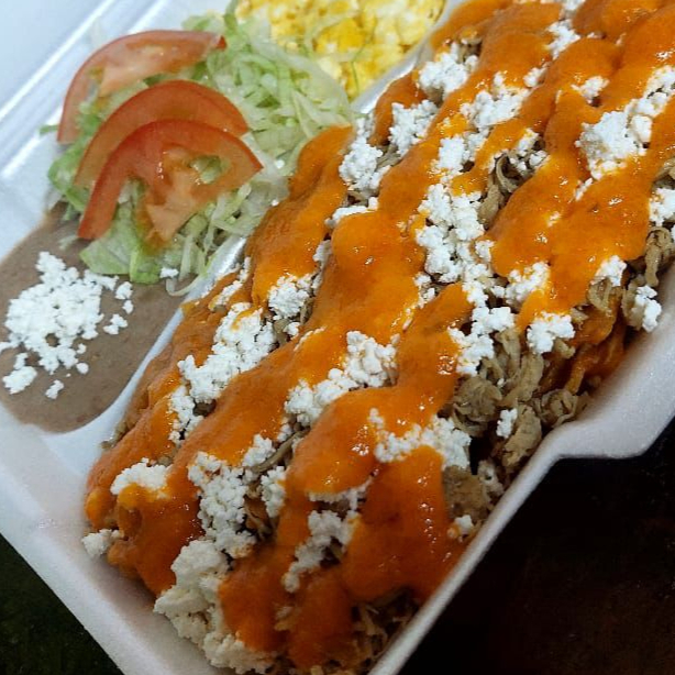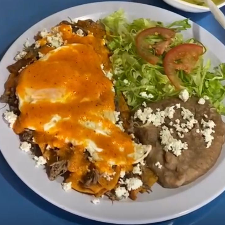 Totopos bañados en salsa de tomate con queso fresco, deshebrada natural y un huevo estrellado, acompañado de frijoles y lechuga.