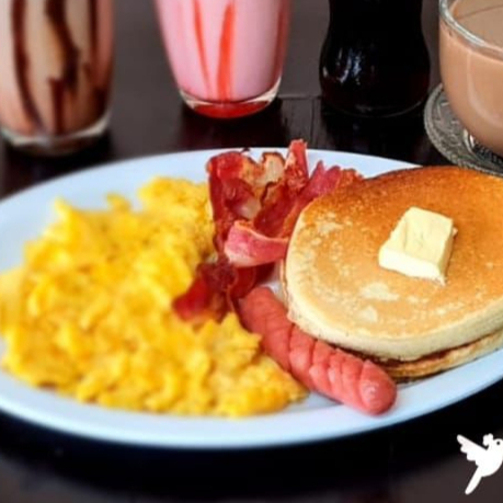 2 hotcakes con huevo revuelto, una salchicha y tiras de tocino