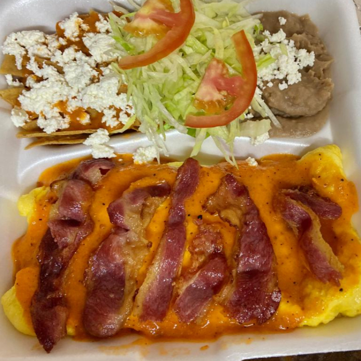 Torta de huevo rellena de frijoles y queso asadero, bañada en salsa de tomate y tiras de tocino, acompañado de una porción de chilaquiles, y lechuga.