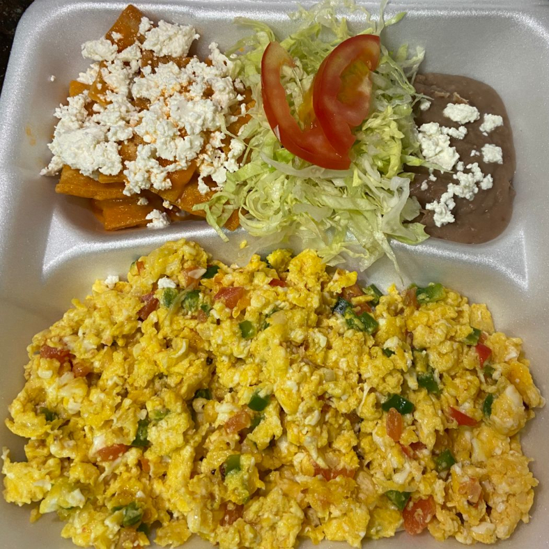 Huevo revuelto con ingrediente a elegir, acompañado de una porción de chilaquiles, frijoles, y lechuga.