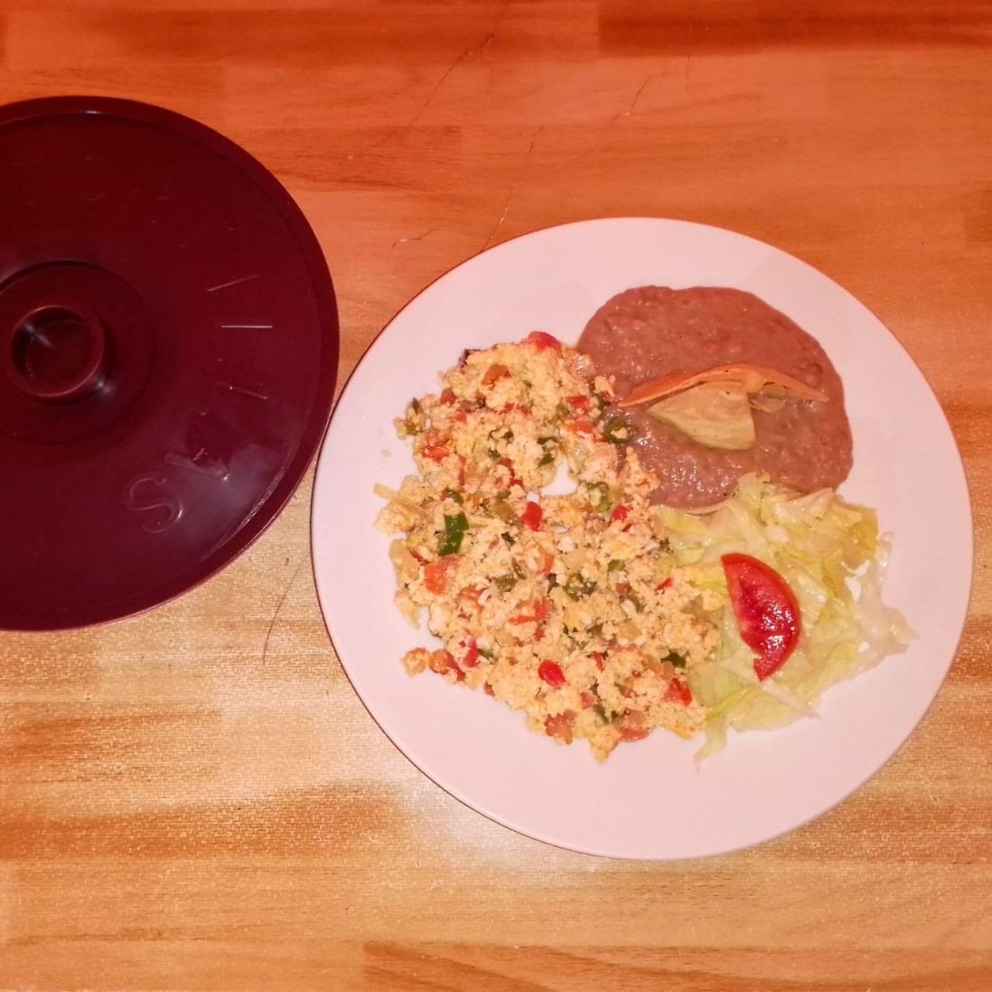 Arroz, frijoles y ensalada.