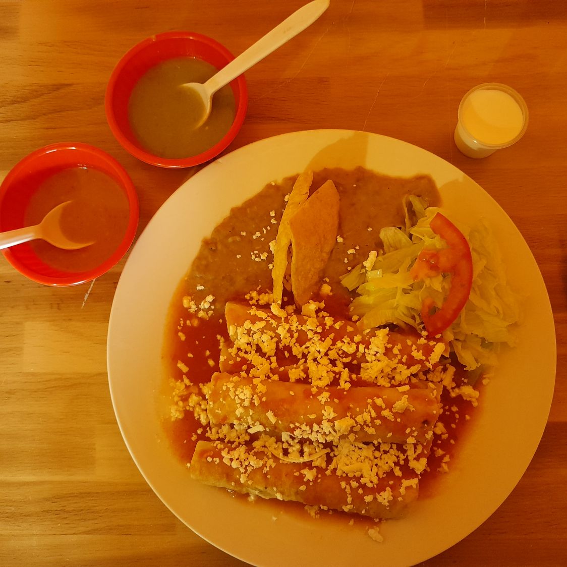 Totopos en salsa (2 de quesos) ensalada y frijoles