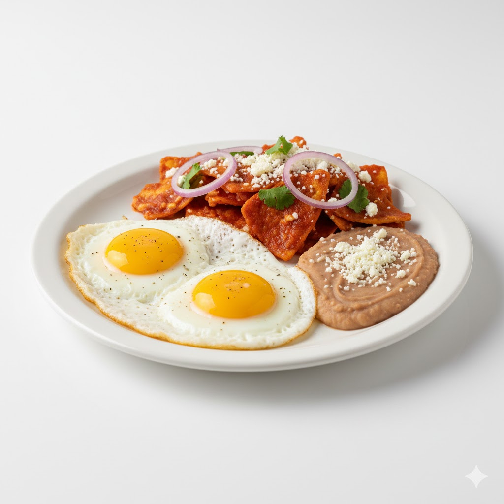 ACOMPAÑADO DE FRIJOLES Y CHILAQUILES
