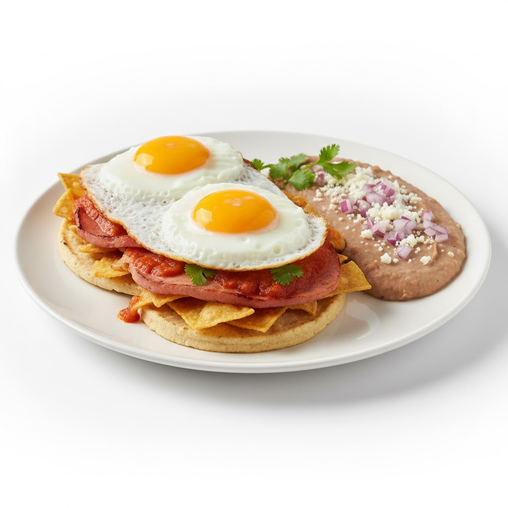 HUEVOS ESTRELLADOS MONTADOS SOBRE 2 TOSTADAS CON JAMON, FRIJOLES Y CHILAQUILES