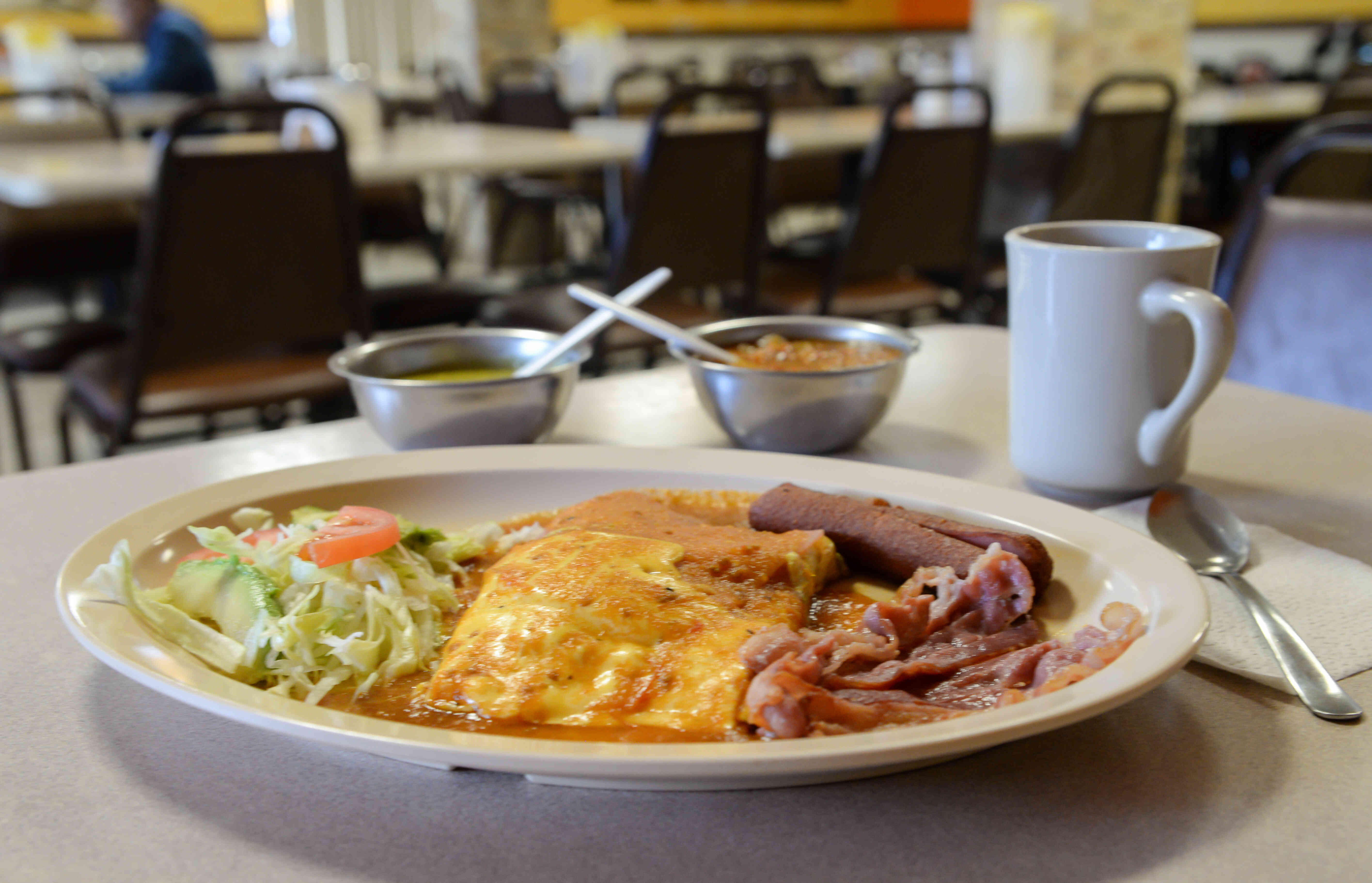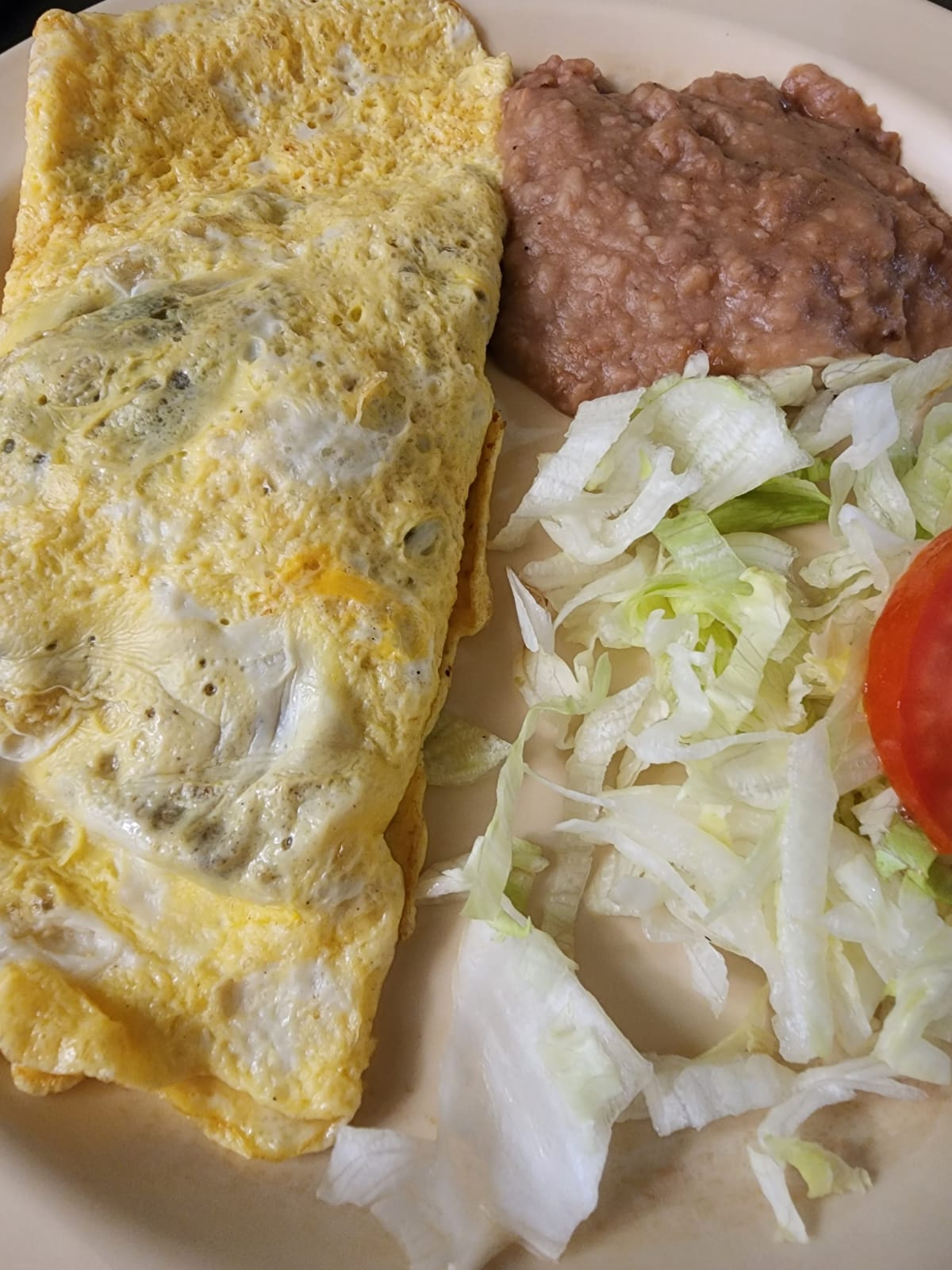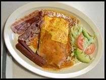 Tortilla de huevo rellena de frijoles, jamón y queso amarillo, cubiertos en salsa ranchera, acompañado de salchicha, tocino y ensalada verde con aguacate. Acompañado de 4 tortillas de maíz.