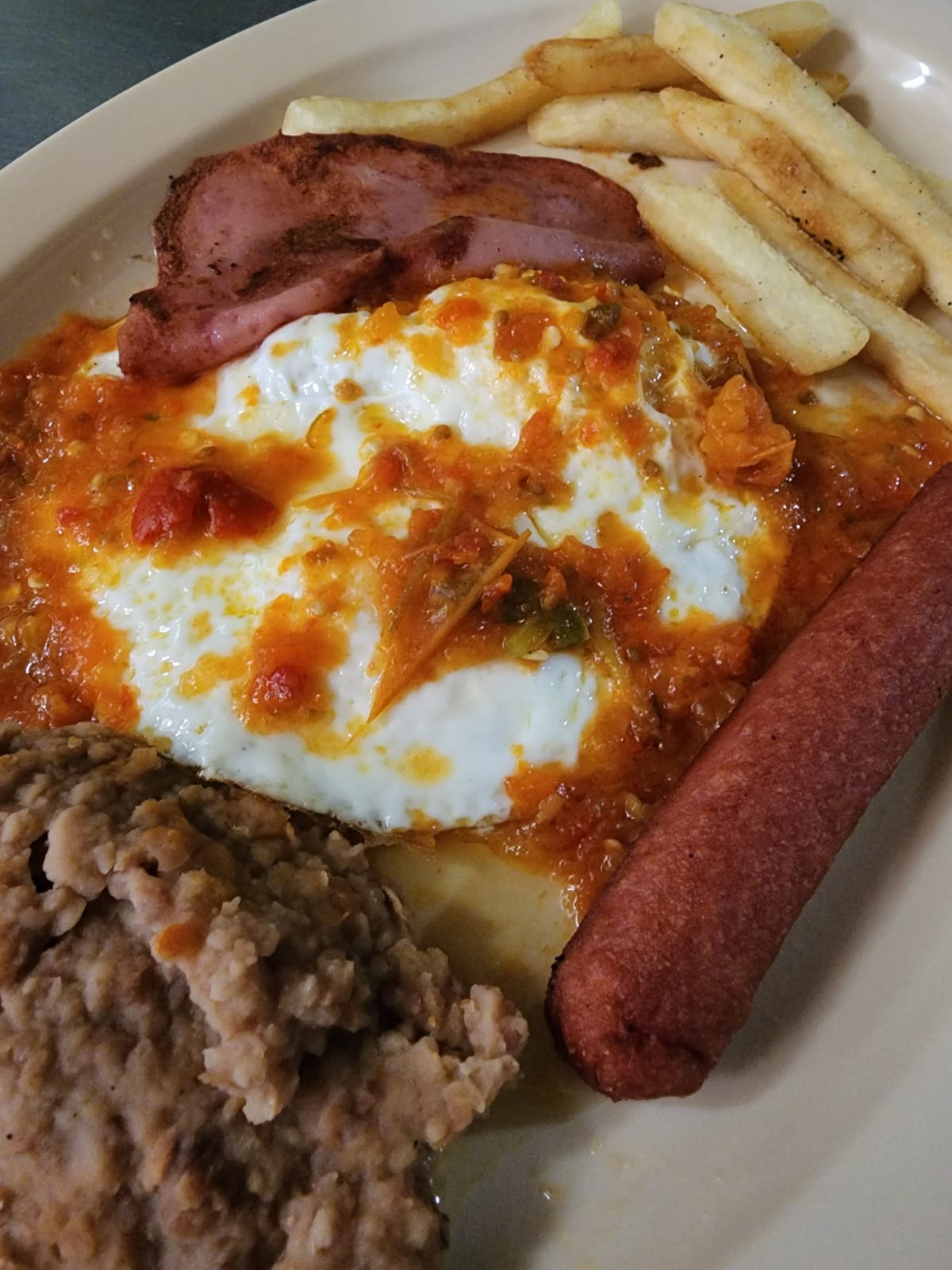 Sobre una cama de tortilla,jamón,queso amarillo, bañadas en salsa ranchera.