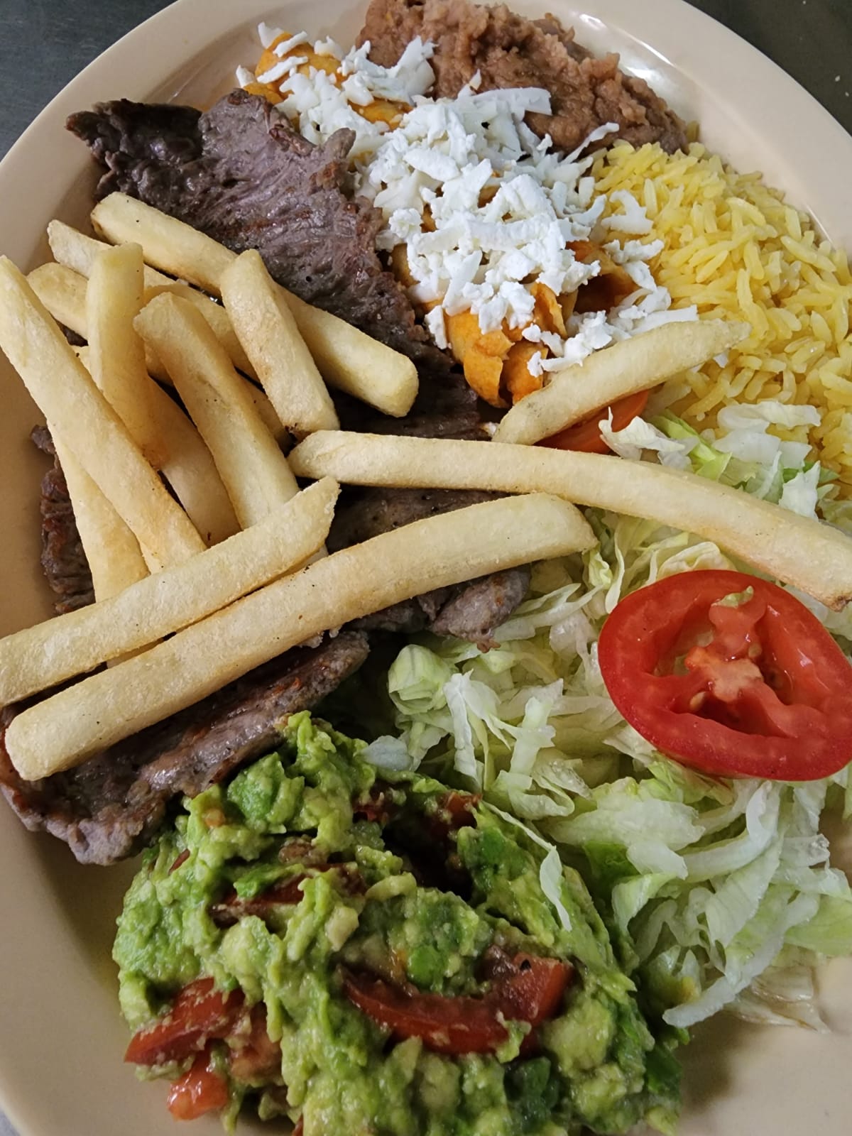 Incluye arroz y frijoles, papas fritas y ensalada.