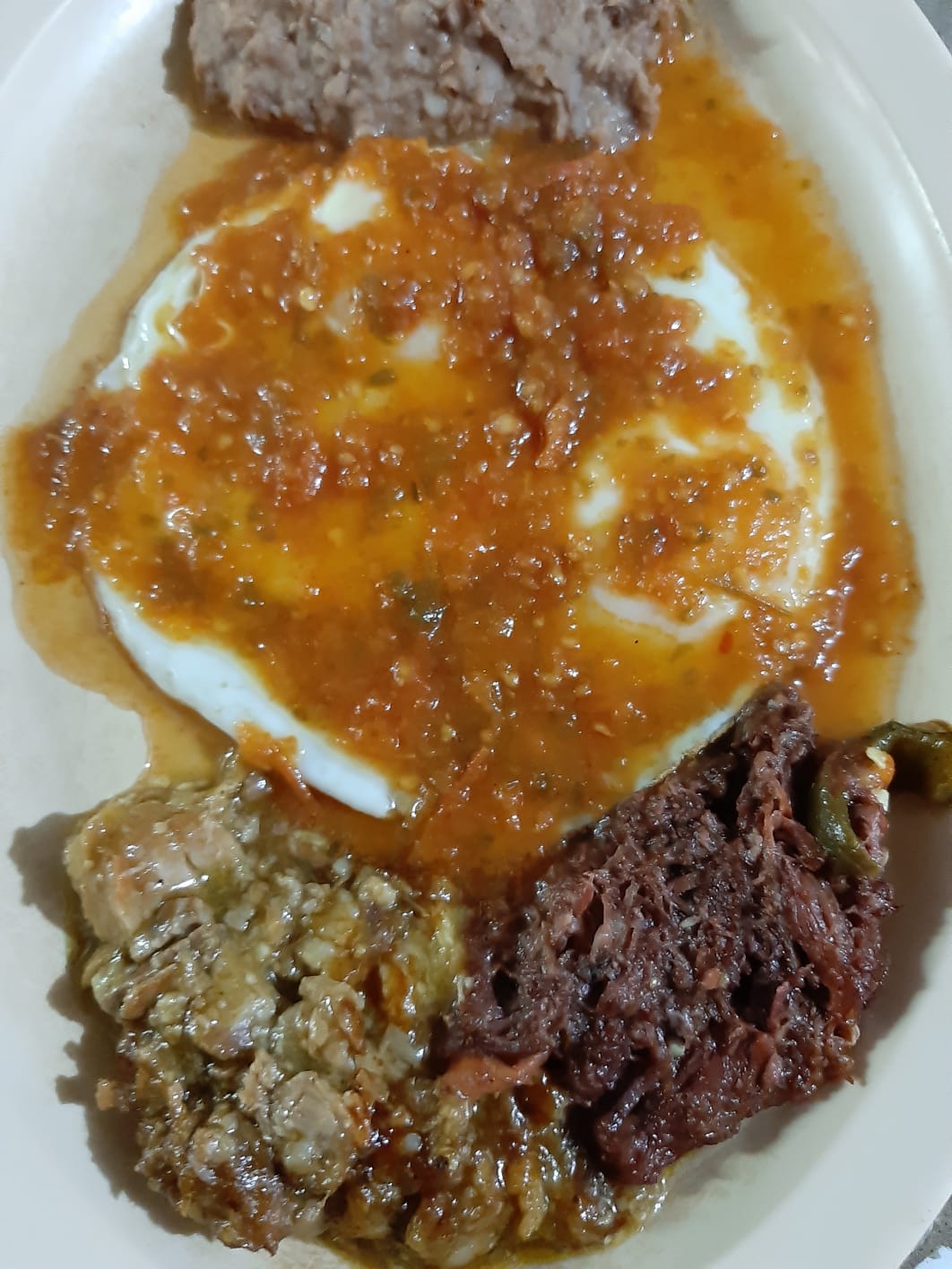 Huevos estrellados en una cama de machaca a la mexicana o machaca natural acompañado de frijoles.