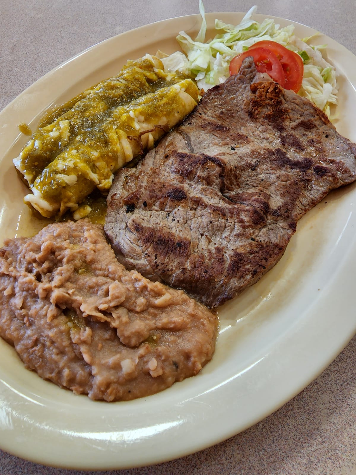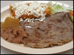 2 Enchiladas tipo suizas, rellenas de queso. Acompañadas de bistec de res. Incluye frijoles y ensalada de lechuga.