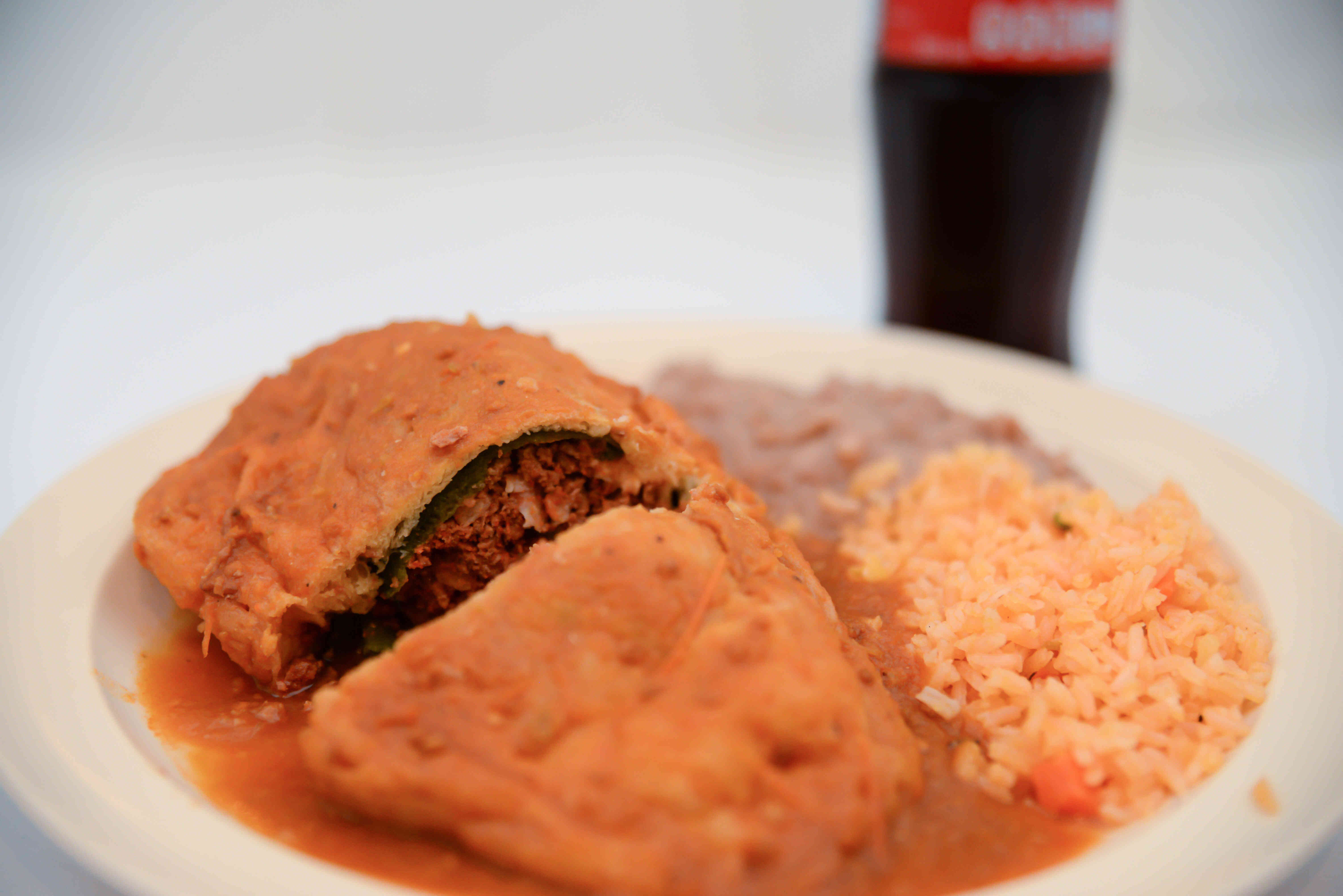 chile poblano relleno al gusto, lampreado, Incluye arroz y frijoles.