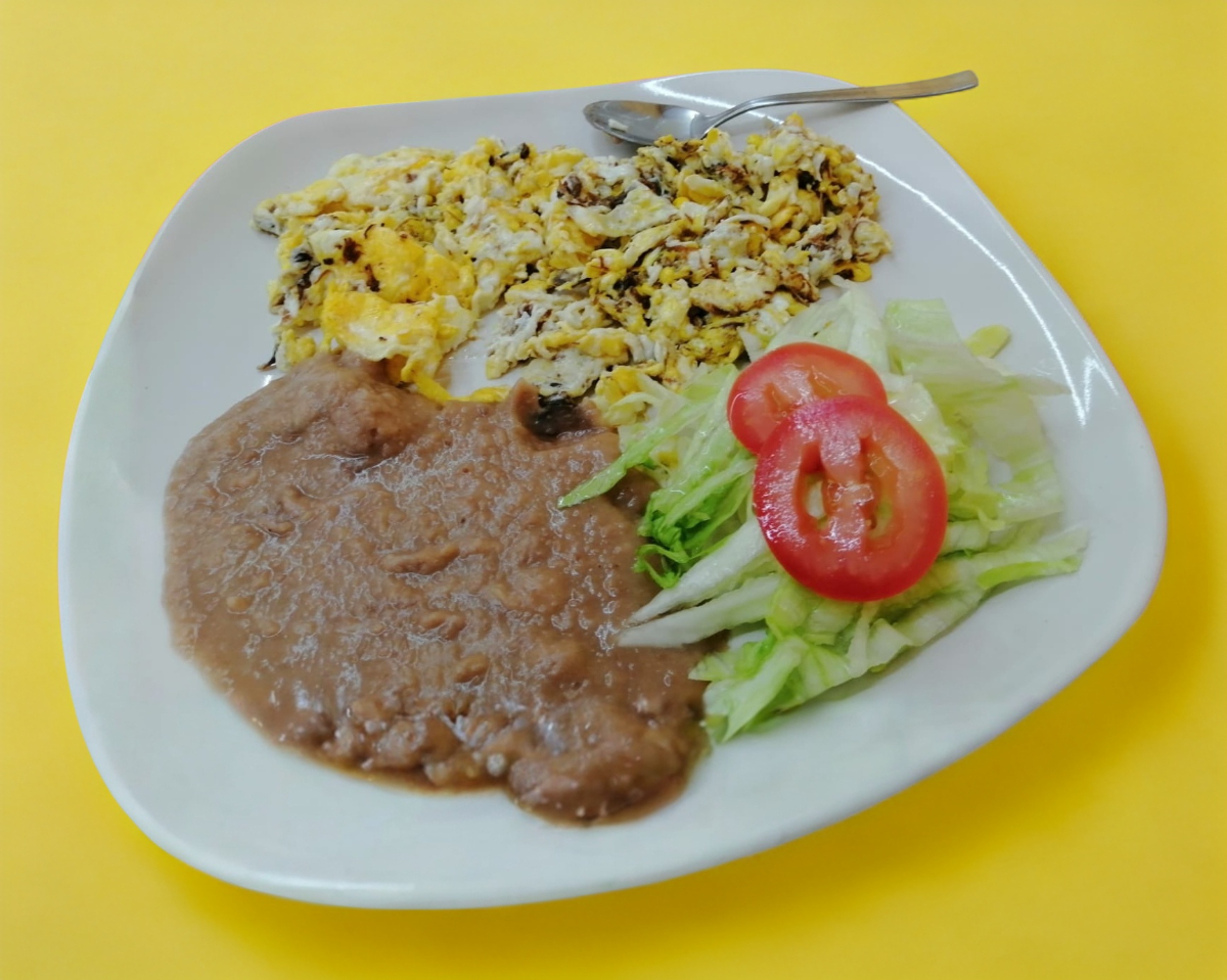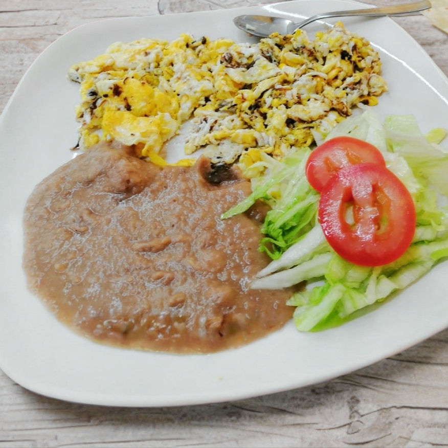 Huevo A Elejir El De Tu Preferencia Acompañado De Frijoles Y Ensalada De Lechuga.
