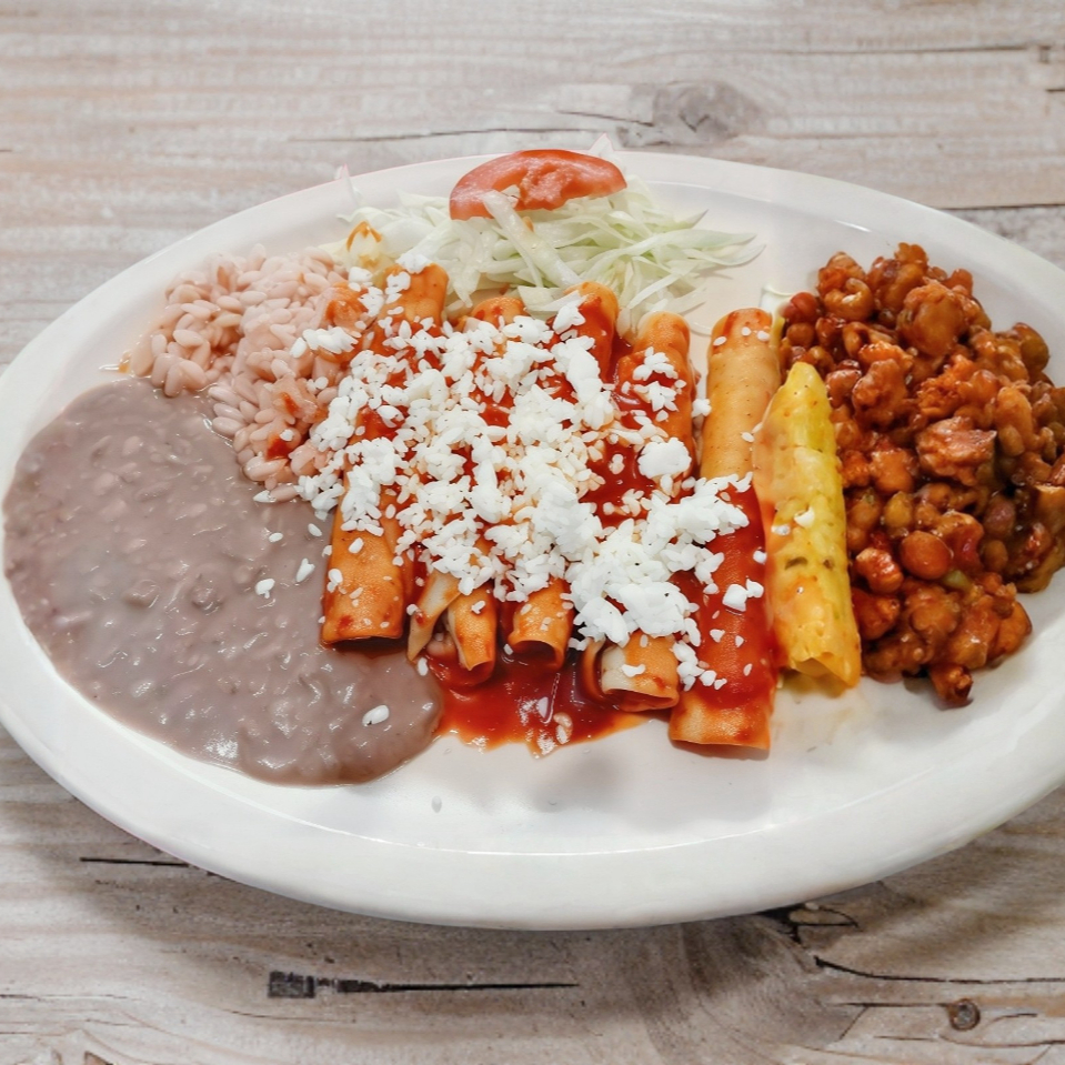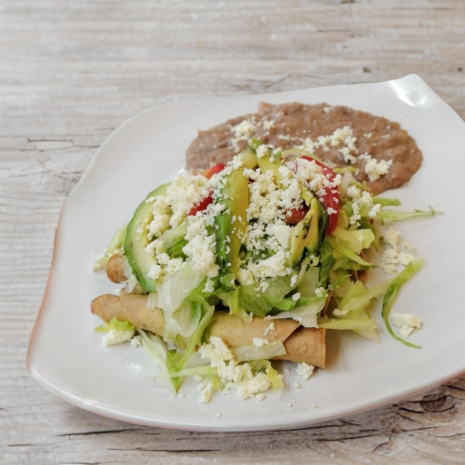 4 Flautas De Desebrada, Queso O Pollo, Acomapañas De Arroz, Frijoles,Lechuga Y Queso Fresco.