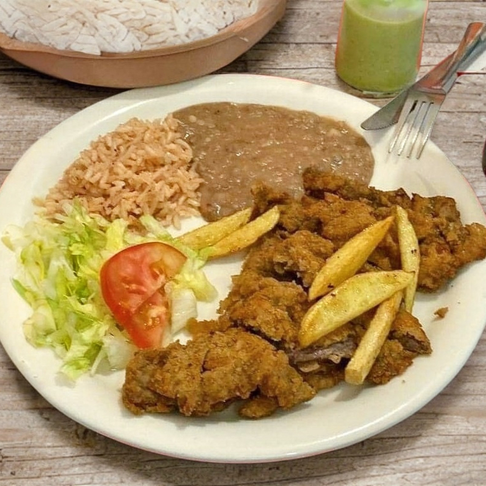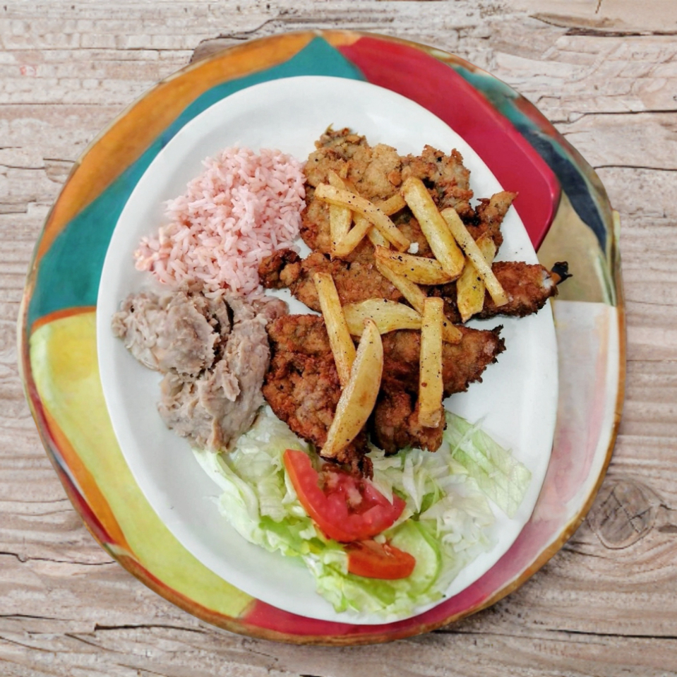 Milanesa De Res Empanizada Acompañada De Arroz, Frijoles,Lechuga Y Papas Fritas.