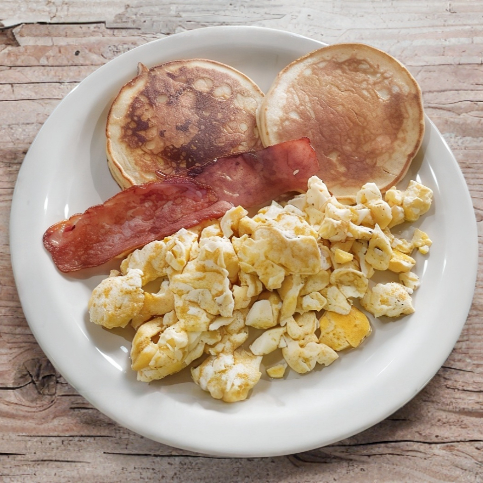 2 Hot cakes, 2 huevos al gusto, 1 rebanada de tocino, 1 cafe