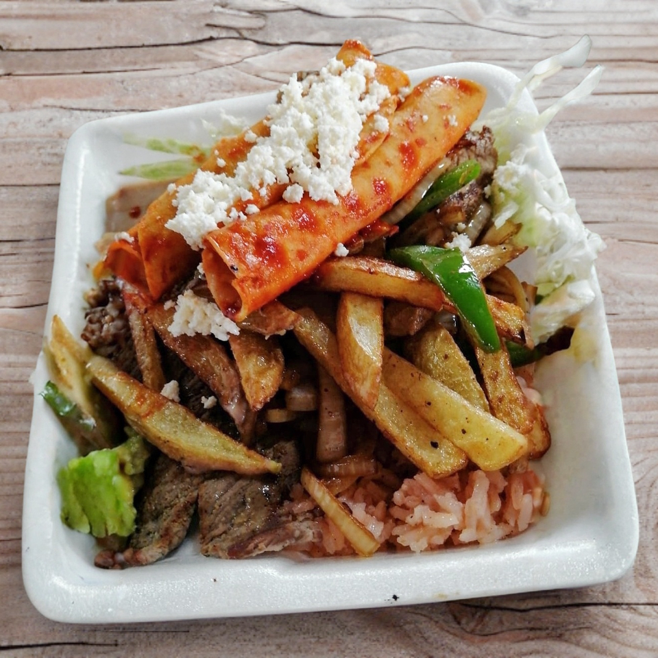 Carne De Milanesa A La Plancha A Compañada De 2 Enchiladas , Guacamole,Arroz,Frijoles,Lechuga,Papas Fritas, Cebolla Frita Y Chile toreado.
