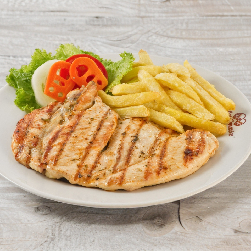 Pollo A La Plancha Acompañada De Arroz, Frijoles,Lechuga, Papas Fritas,Cebollita Frita Y Chile Toreado.