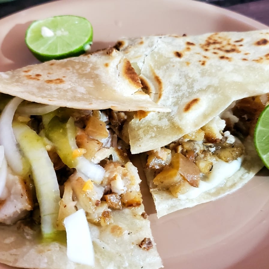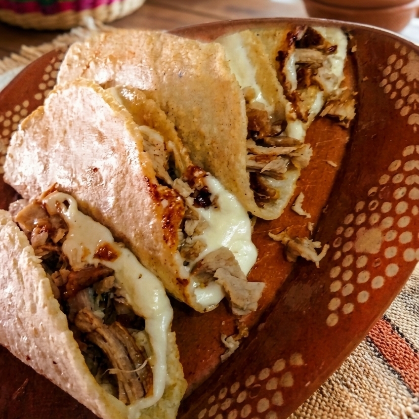 Son tacos con queso y carnitas