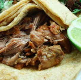 Carnitas de maciza, con cilantro, cebolla y salsa.